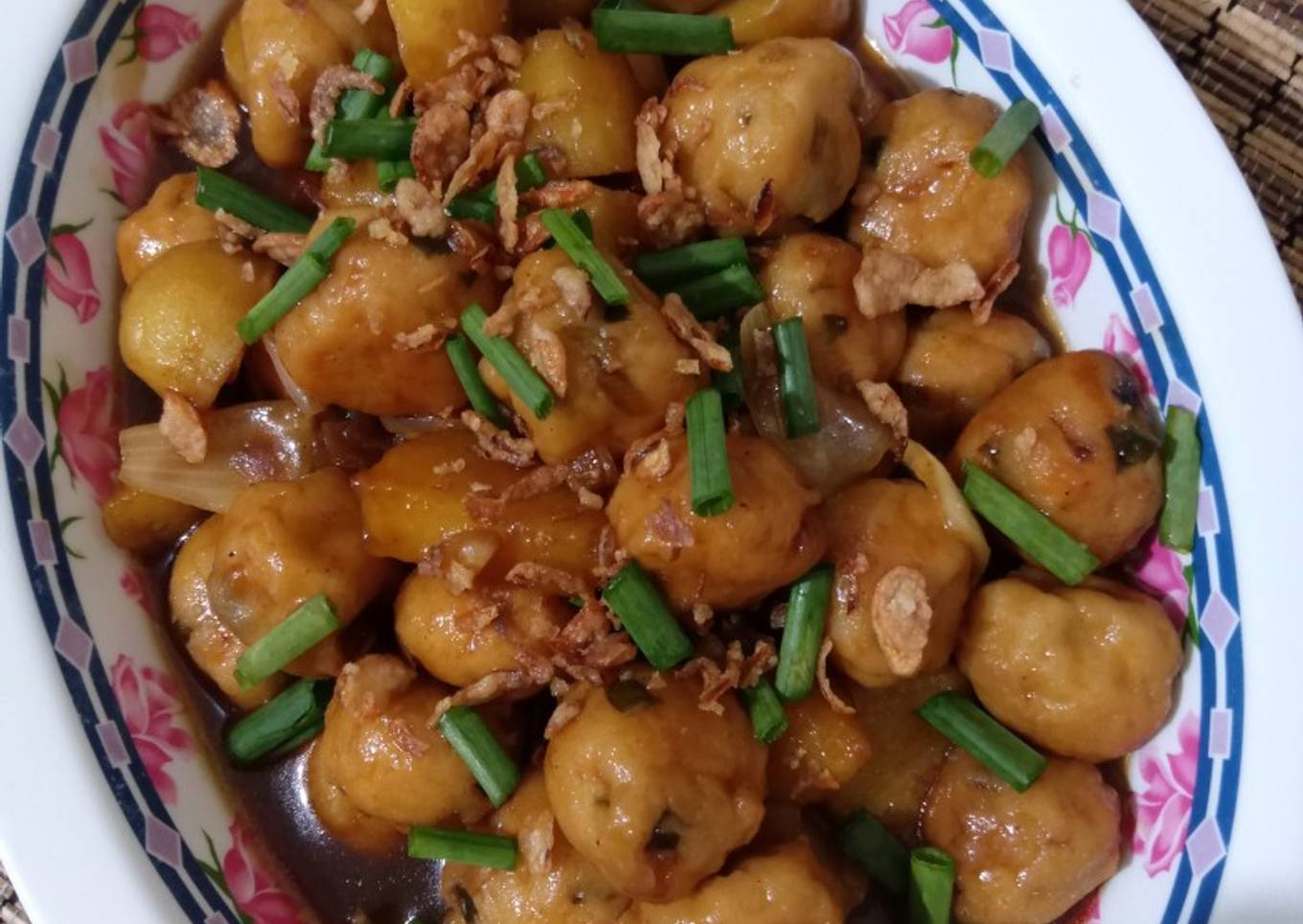 - Tumis bawang putih yang sudah dicincang halus, masukkan kentang goreng dan bola ayam. Beri air